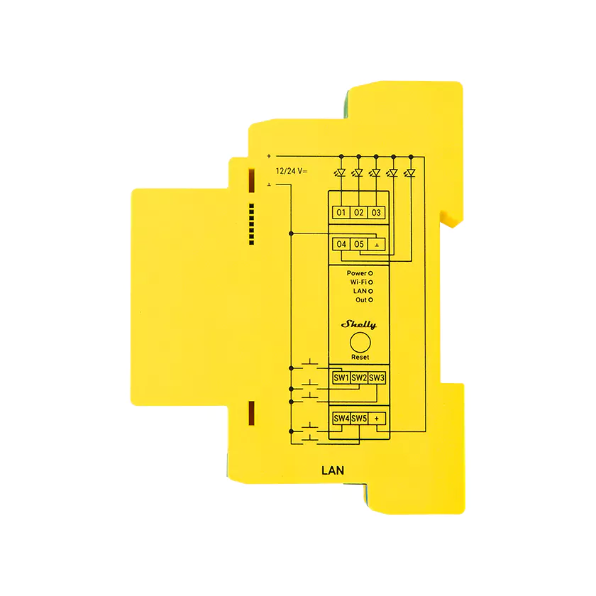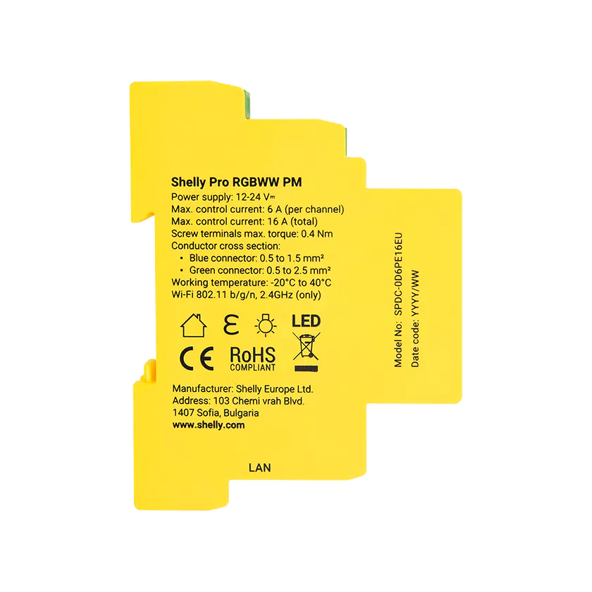 O Shelly Pro RGBWW PM é um módulo profissional de controlo para fitas LED RGBWW, oferecendo gestão de iluminação avançada em 5 canais (RGB + branco quente + branco frio). Compatível com 12V e 24V, este controlador garante efeitos de luz suaves, transições precisas e total personalização através de LAN, Wi-Fi ou Bluetooth.